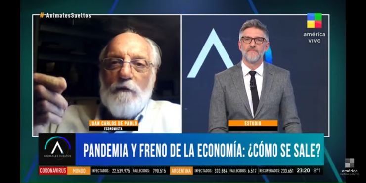 20-09-2020 El economista Juan Carlos de Pablo, analizaró en #AnimalesSueltos la situación económica del país:”No me explico cómo el Gobierno todavía sigue vendiendo los 200 dólares”. Provocador como siempre, le reclamó a Martín Guzman que “asuma” como ministro y al presidente que formule un plan